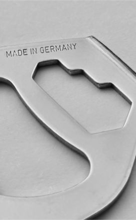 back back forward forward Measure / Material: approx. 11,5 cm,  stainless steel Functions: paint can opener, 6- / 8- / 10 mm  wrench, bottle opener, hook to open paint  buckets and to wipe off paint from the stir  stick  MADE IN SOLINGEN/GERMANY Contact Legal Notice Privacy Policy DUISBERG production DE PAINT CAN OPENER VERFBLIKOPENER NO. 7296-E